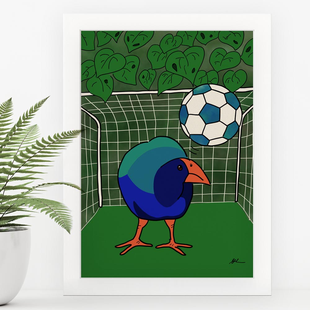 Unframed A4 print of a Takahē playing goalie in front of the nets, saving the day by heading off the opponents’ ball.
