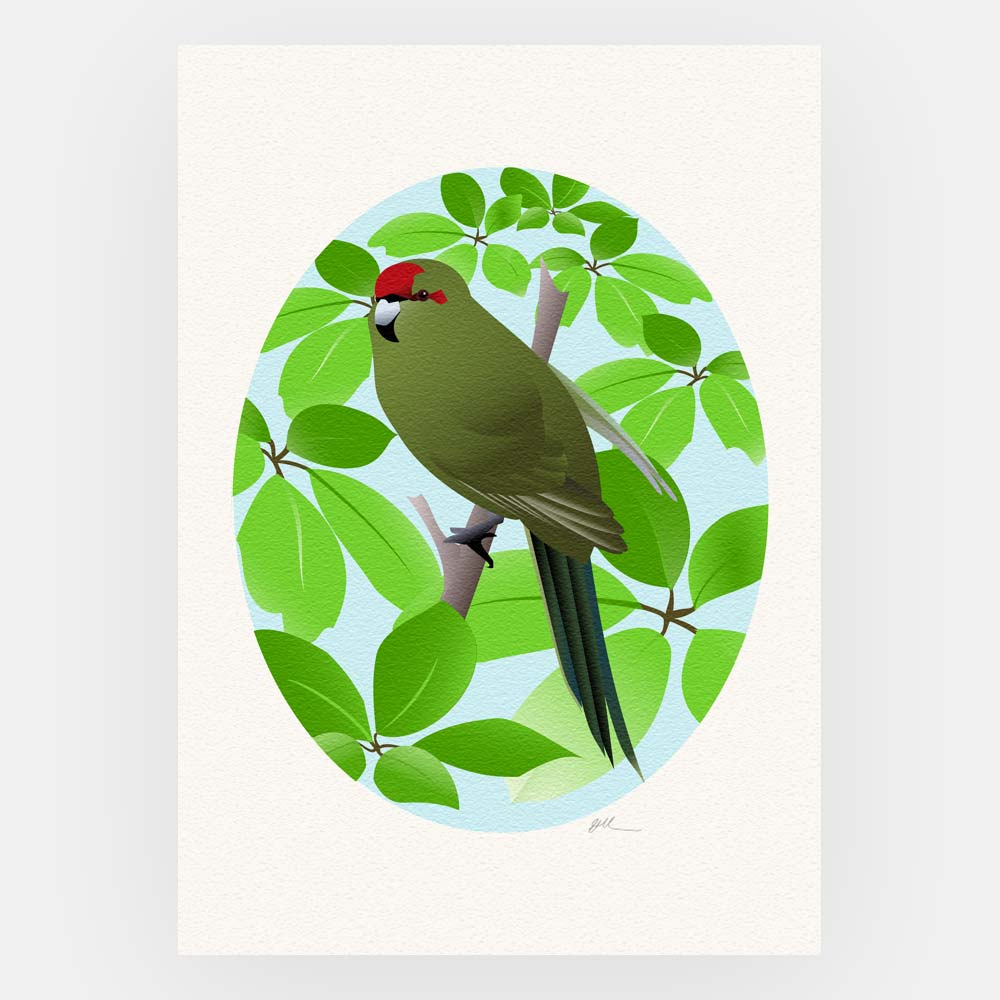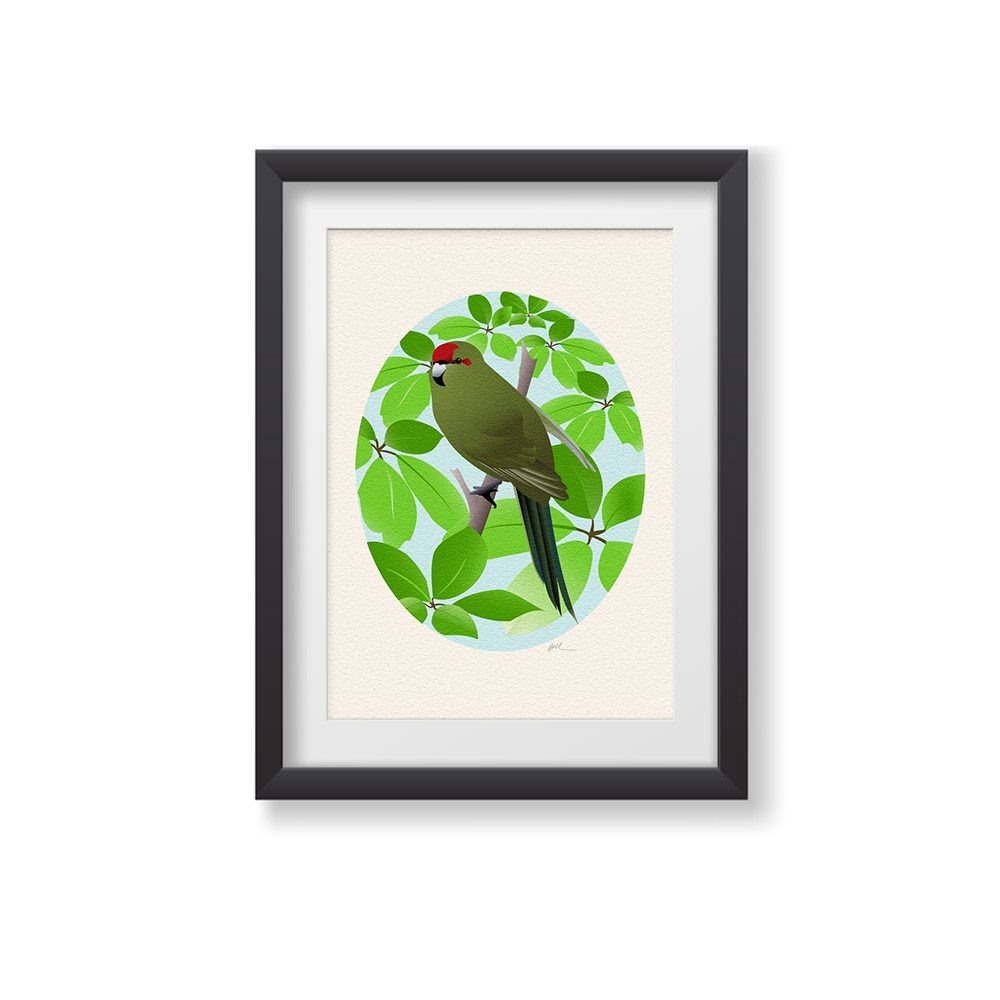Unframed A4 size print of our original Kākāriki illustration, nestled amongst whauwhaupaku leaves.